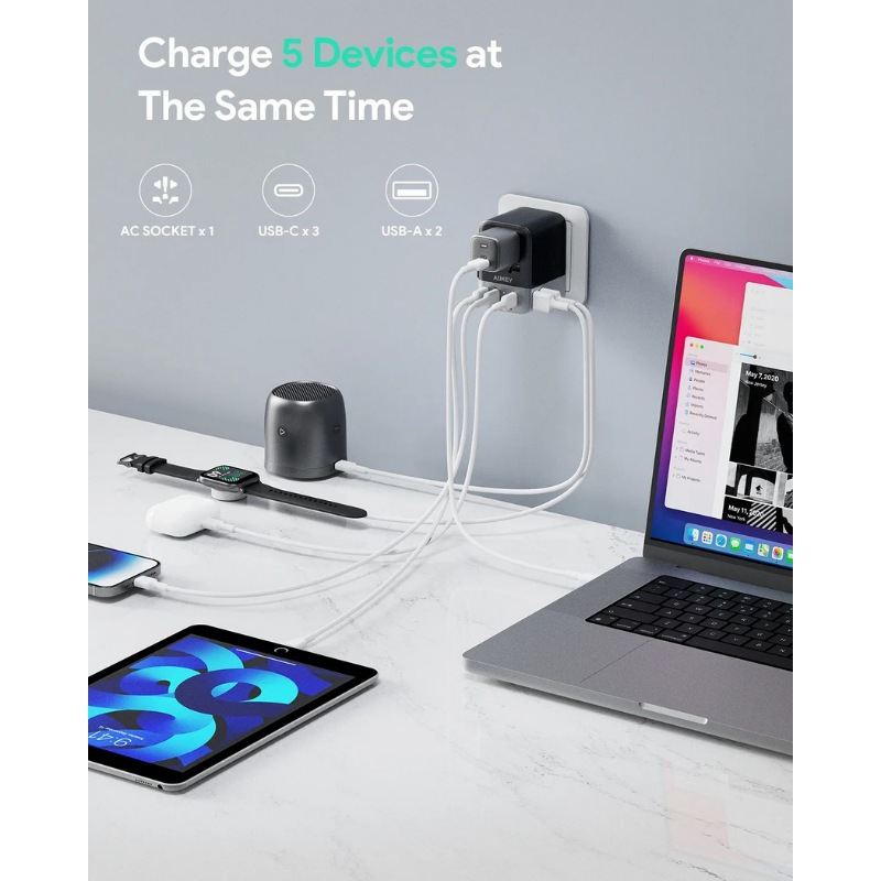 Củ sạc du lịch đa năng tích hợp 3 cổng USB-C, 2 cổng USB‑A và ổ cắm AC, cho tổng công suất lên đến 35 W, giúp bạn vừa sạc nhanh smartphone, tablet, laptop nhỏ, vừa cung cấp điện cho các thiết bị điện dân dụng nhỏ gọn mọi lúc, mọi nơi.