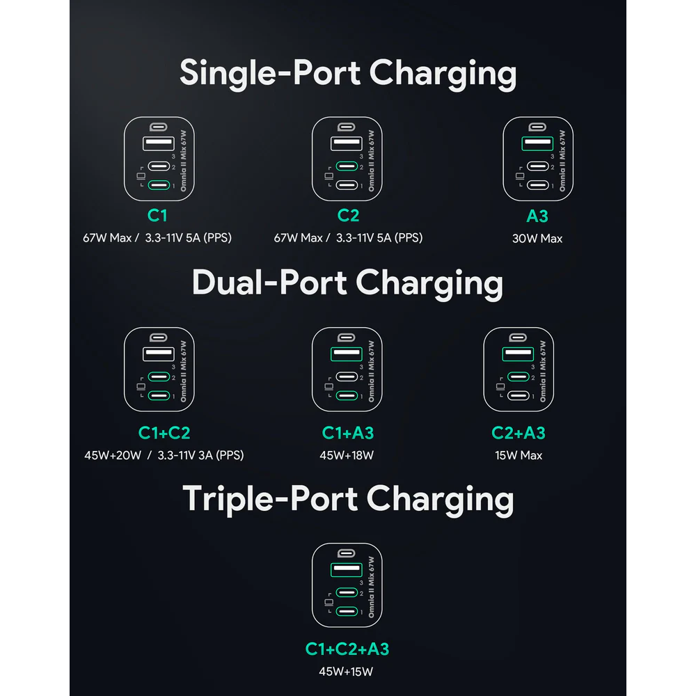 USB-C1 + USB-C2 + USB-A Output: 45W+15W (Max 60W)