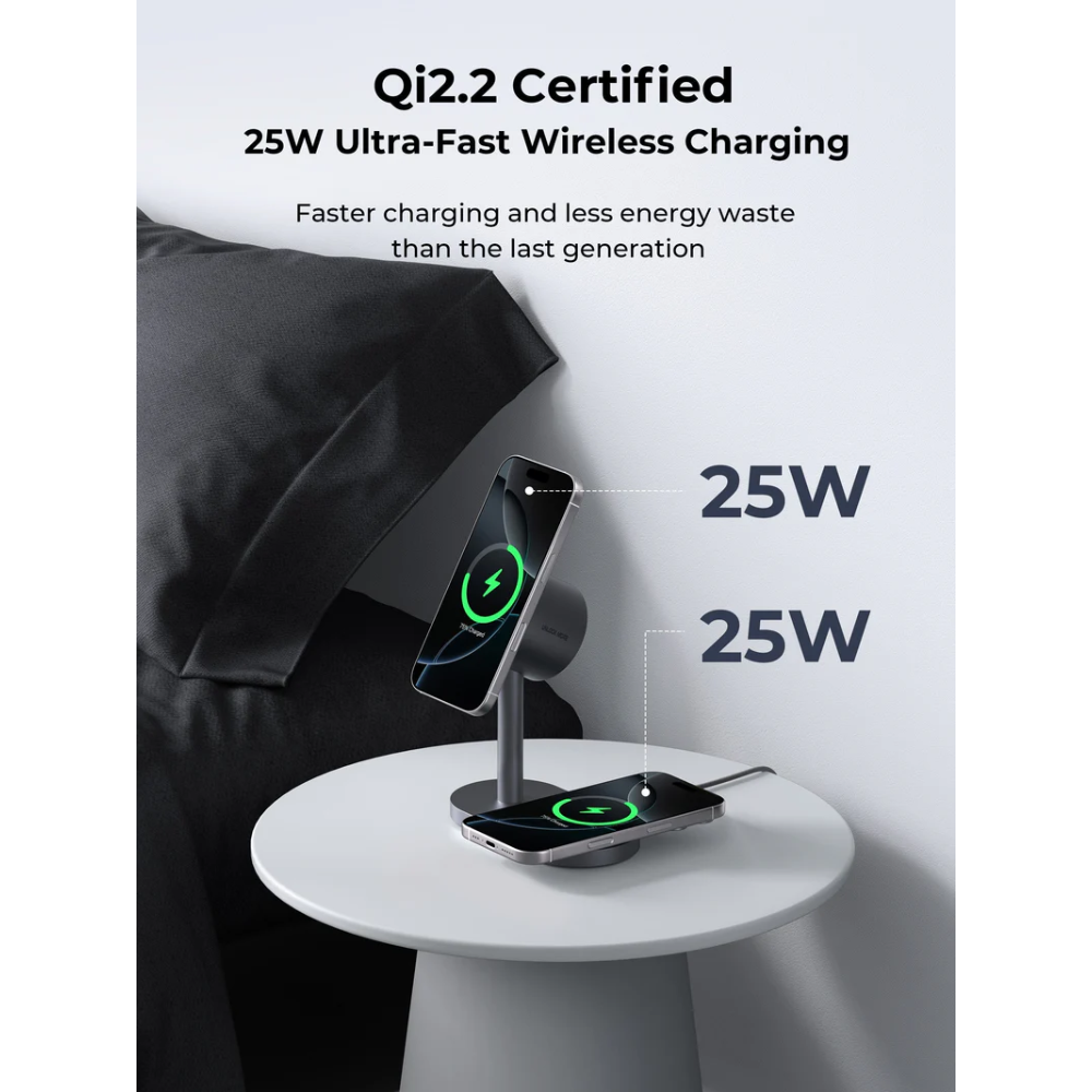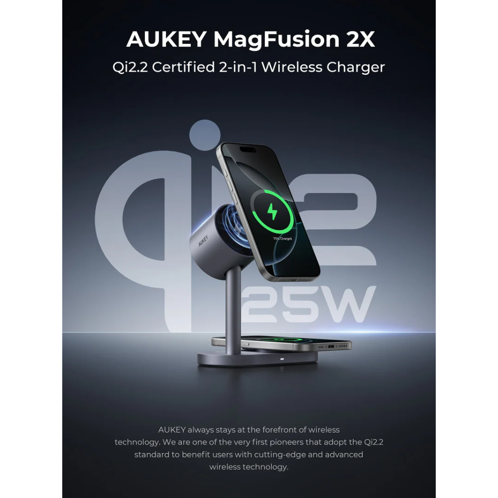 Tính năng Đế Sạc Đứng Không Dây 2-in-1 AUKEY Qi2.2 MagFusion 2X LC-MC213 25W (Wireless Charging Qi2.2 25W, Strong Magnetic Force, 360° Rotation)