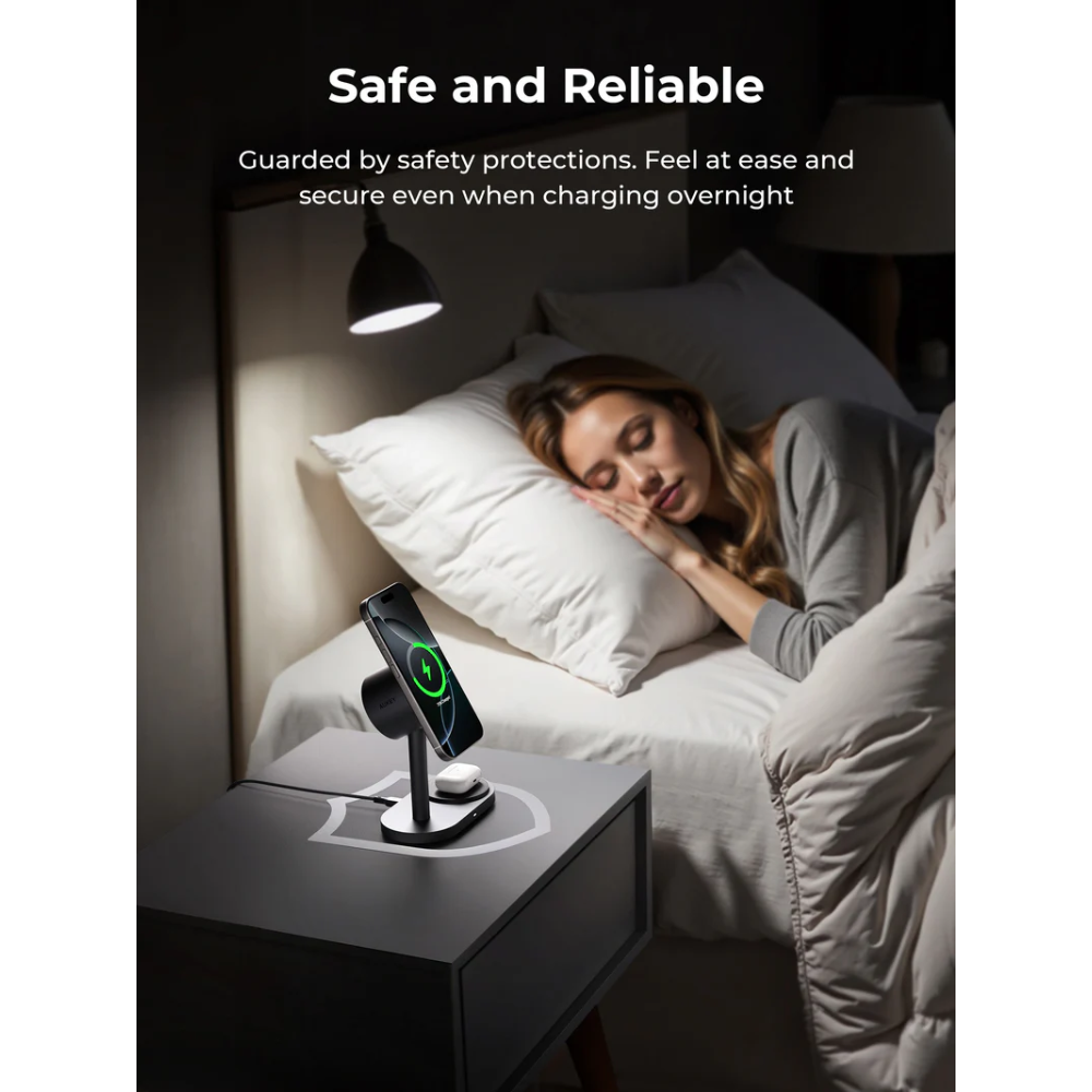 Tích hợp công nghệ MagFusion (tương thích MagSafe) với lực hít nam châm cực mạnh, giúp giữ điện thoại của bạn cố định chắc chắn trên đế sạc, ngay cả khi xoay hoặc điều chỉnh.