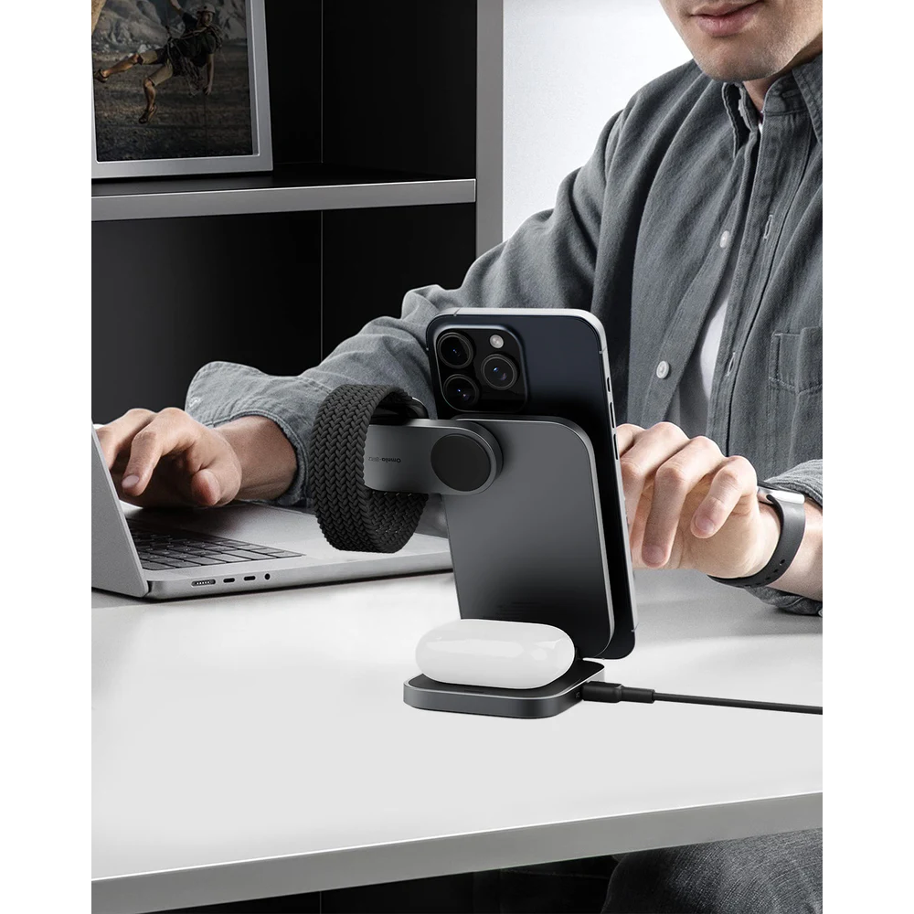 Phần đế sạc chính cho điện thoại được trang bị công nghệ từ tính tương thích MagSafe, cho phép sạc nhanh không dây với công suất tối đa lên đến 15W cho các dòng iPhone. Lực hít từ tính mạnh mẽ giữ điện thoại chắc chắn, cho phép bạn xoay ngang hoặc dọc thoải mái.